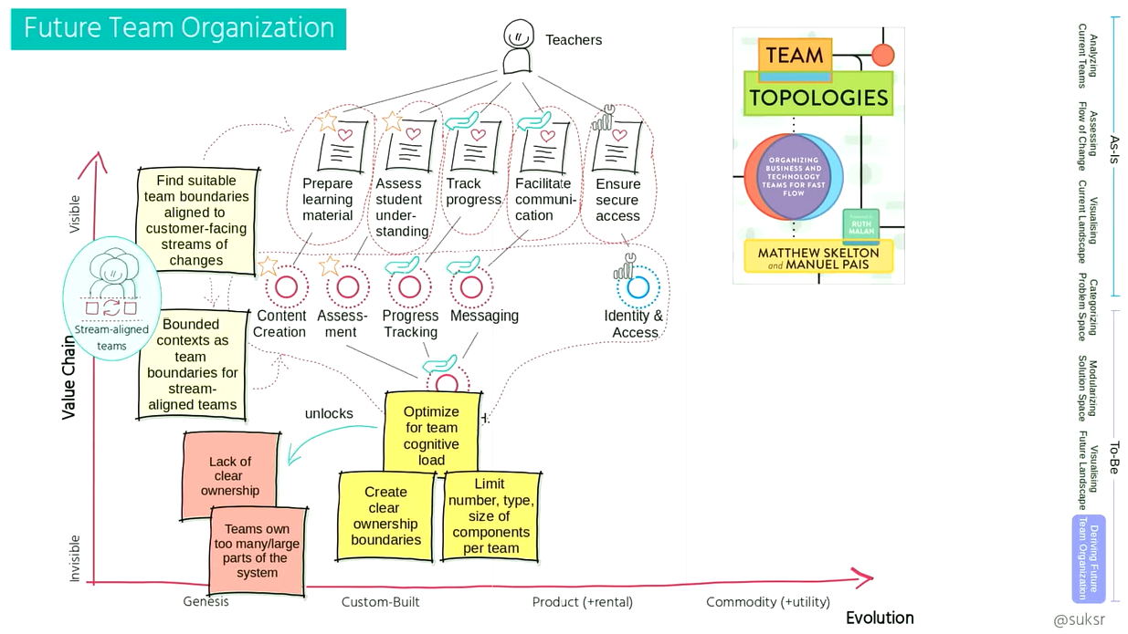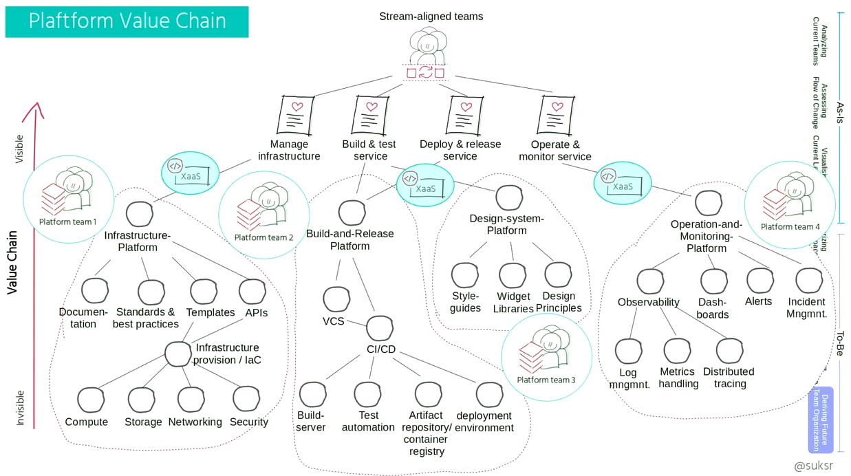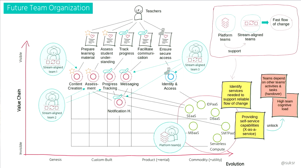 - You can use the same Wardley Map to analyze how to create platforms. Here the end user is the value stream team instead of the customer.
