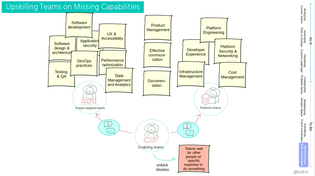 - Help Value Stream and Platform teams to upskill on missing capabilities. This unblocks teams to wait on someone with a certain expertise.